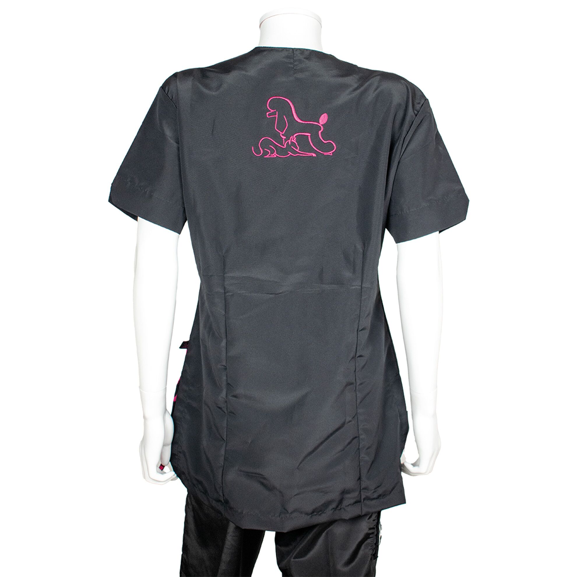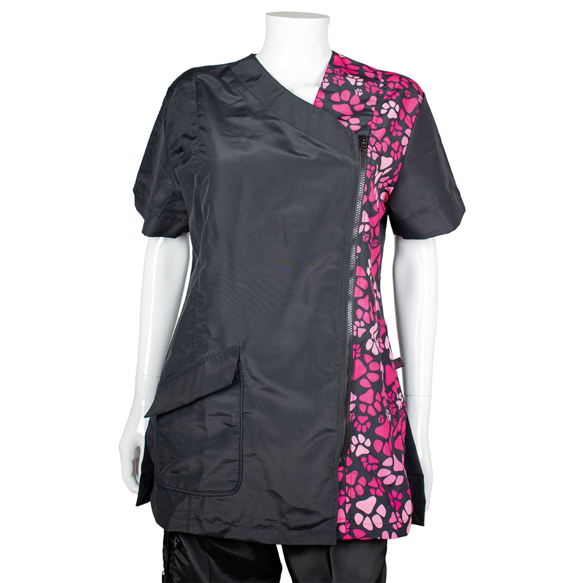 PHOENIX UNIVERSAL | 1-A3183La blouse de toilettage Maria motif pattes roses allie confort, praticité et protection pour un usage quotidien en salon