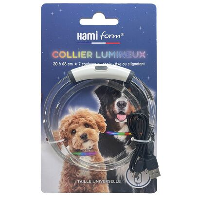 HAMIFORM | 1-F2798Collier lumineux Hamiform (20–68 cm) : l’accessoire idéal pour des balades nocturnes plus sûres. Rechargeable en USB-C, réglable et 7 couleurs au choix, il améliore la visibilité de votre chien en mode fixe ou clignotant.